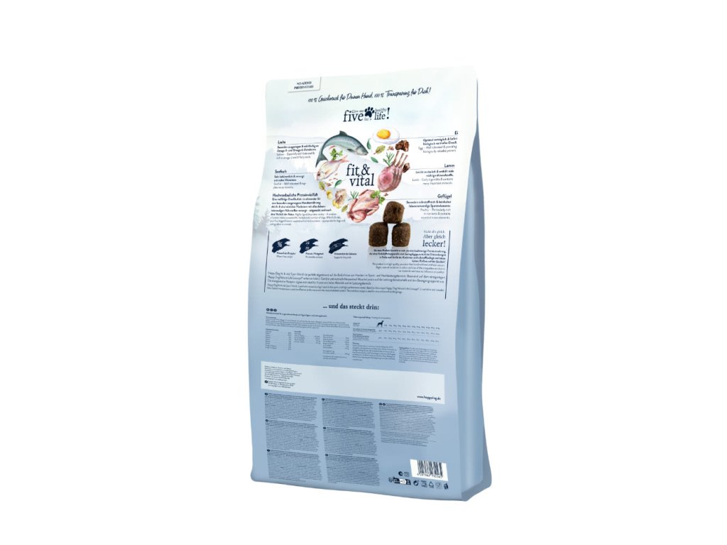 živočišné bílkoviny* (20 % drůbež, 4 % jehněčí), kukuřičná mouka, kukuřice, živočišný tuk (mezi jiným z drůbeže), rýžová mouka, ječmen, hemoglobin*, rybí moučka (4 %, z toho 50 % lososová moučka), škvarky, játrový hydrolyzát, slunečnicový olej, cukrovkové řízky* (odcukřené), jablečná dřeň*, řepkový olej, chlorid draselný, droždí*, chlorid sodný, mořské řasy*, lněné semeno(0,15 %), vejce celá* (0,1 %), maso z mušlí* (0,02 %), droždí* (extrahované), ostropestřec mariánský, artyčok, pampeliška, zázvor (0,012 %), list břízy, kopřiva, heřmánek, koriandr, rozmarýn, šalvěj, kořen lékořice, tymián, (sušené byliny celkem: 0,14 %); *) sušené.