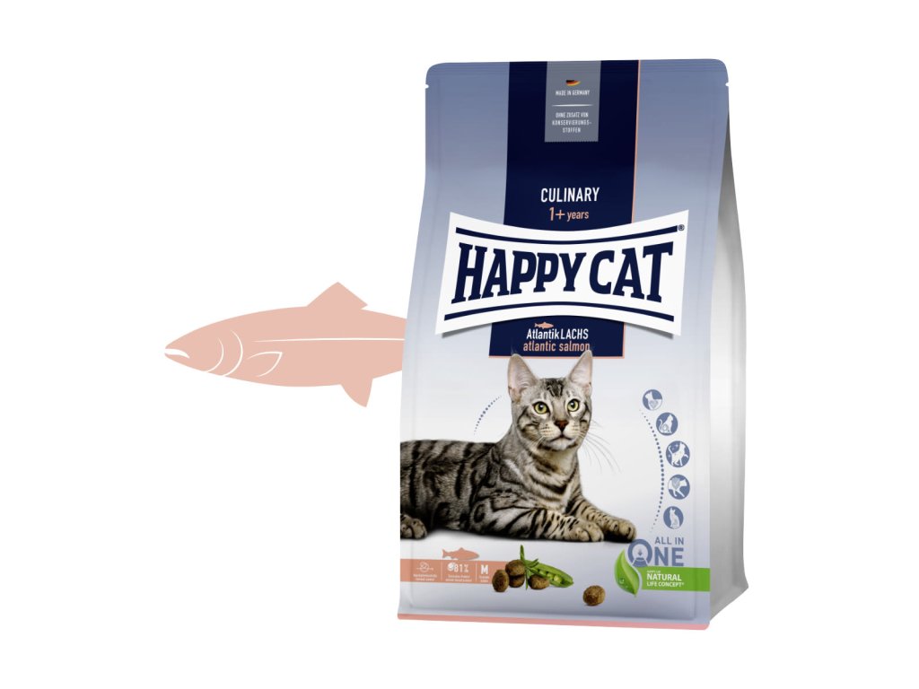 Happy Cat Atlantik-Lachs podporuje sníženou tvorbu chlupových smotků, poskytuje cenné omega-3 a omega-6 mastné kyseliny a je vhodné také pro obzvláště aktivní kočky.