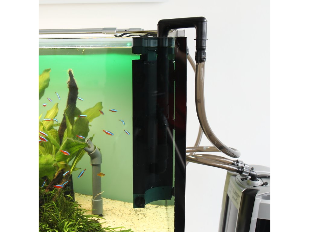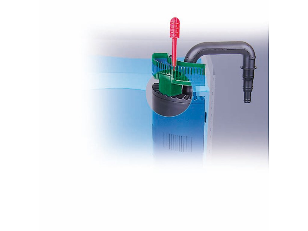 Vysavač umístěte v akváriu, připojte nasávací hadici vnějšího filtru (namísto dosavadní nasávací trubice), zregulujte seřizovacím vřetenem pro nasávání povrchové vody/z hloubky.