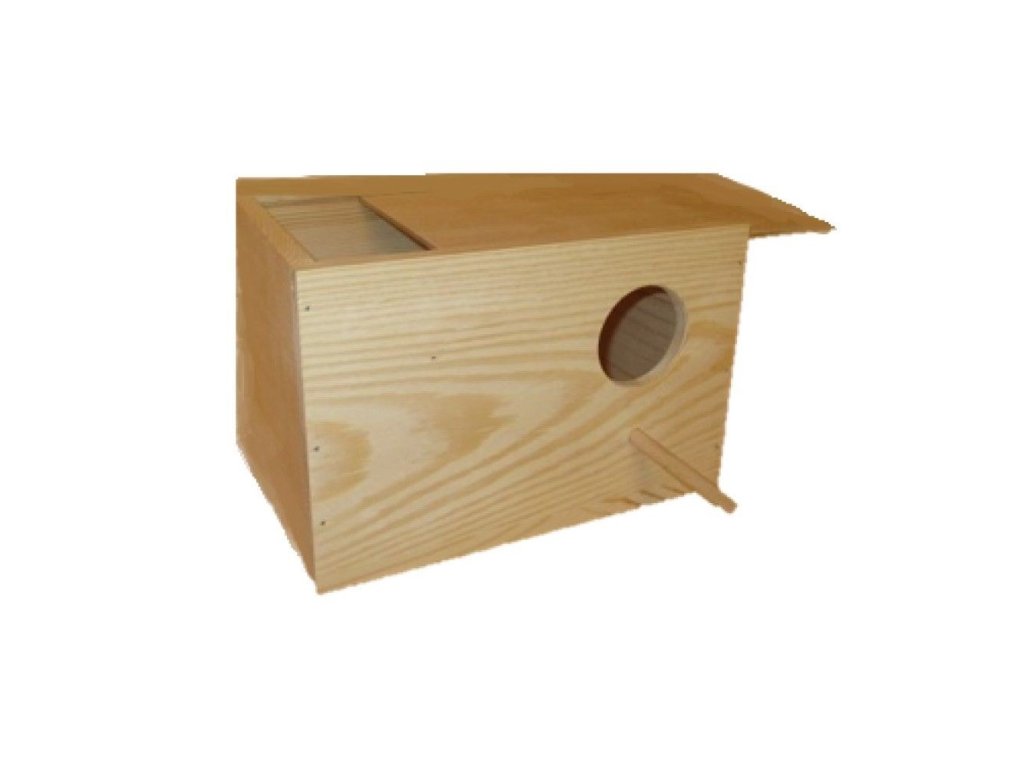 Hnízdící dřevěná budka s bidýlkem. U vstupu do budky je bidýlko. Budka má otevíratelnou stříšku pro snadné čištění.