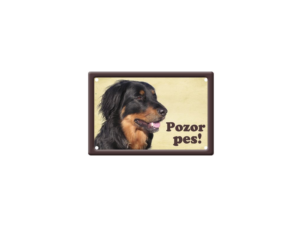 Plechová psí cedulka pro venkovní i vnitřní použití v rozměru 150x100mm, v rozích 4 díry pro uchycení, prolisovaný zdobný okraj tabulky, potištěný plech.