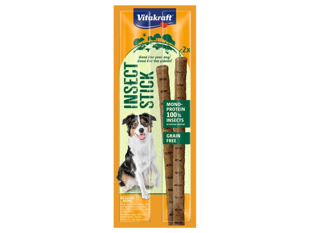 Vitakraft Insect Sticks obsahují pouze jeden zdroj živočišných bílkovin: Larvy mouchy Hermetia illucens. Pamlsky pro psy jsou bez obilnin a jsou vyráběny bez přidaného cukru, bez mléka, vejce a sóji. Ještě jeden bonus pro lidi ohleduplné k životnímu prostředí: Výroba hmyzích pamlsků spotřebovává výrazně méně vody, vyžaduje méně plochy a způsobuje menší emise CO2 než běžná produkce masa - perfektní pro všechny, pro které je důležitá ekologická produkce.