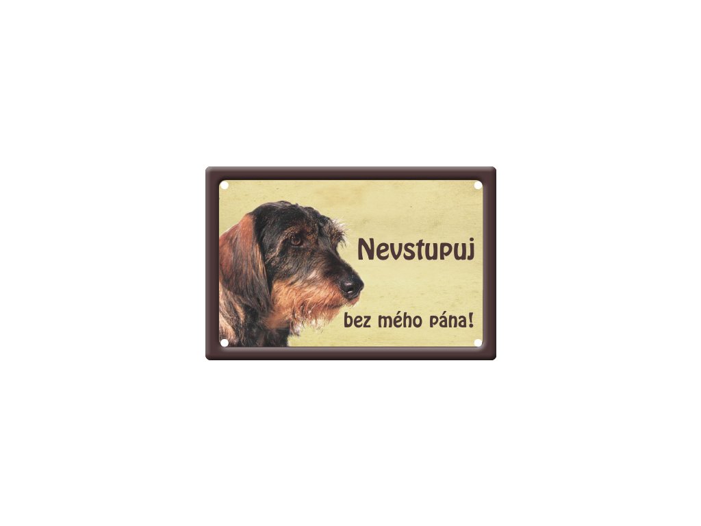 Plechová psí cedulka pro venkovní i vnitřní použití v rozměru 150x100mm, v rozích 4 díry pro uchycení, prolisovaný zdobný okraj tabulky, potištěný plech.