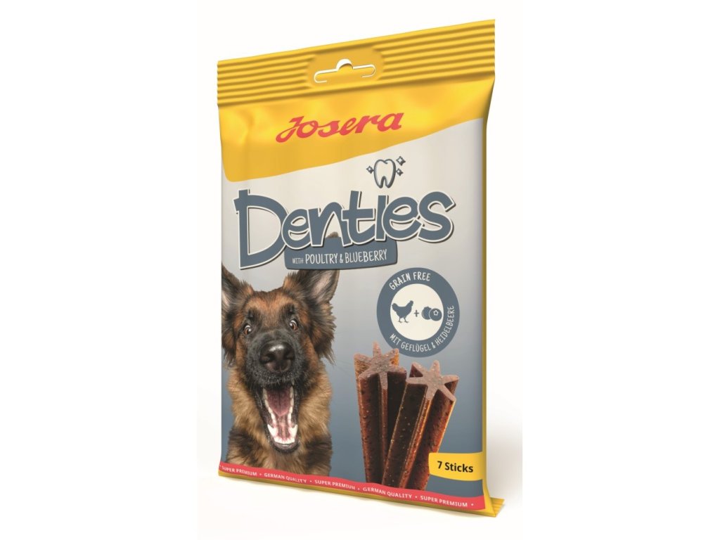 Chutné žvýkací pamlsky pro psy, s jemným ovocným pyré, ideální jako doplněk denního jídelníčku, ve tvaru hvězdičky, vhodné pro dásně, s celulózou, speciální struktura podporuje péči o zuby. Psi mají silný přirozený instinkt žvýkat. Toho lze velmi dobře využít k podpoře každodenní péče o ústní dutinu: Josera Denties s drůbežím a borůvkami mají důmyslnou hvězdicovitou strukturu, která může při intenzivním žvýkání přispět k redukci nepříjemného plaku. Obsažená celulóza může tento účinek dokonce podporovat. Josera Denties s drůbeží & borůvkou jsou nejen vhodné pro ústní hygienu, ale také lahodně chutnají po drůbeži. Recepturu doplňuje borůvkové pyré, které žvýkacím tyčinkám dodává ovocný nádech. Chutné žvýkací tyčinky jsou zcela bez obilovin - pro vysokou snášenlivost.