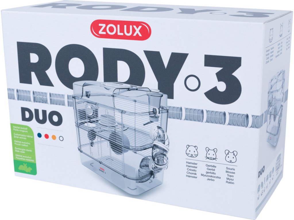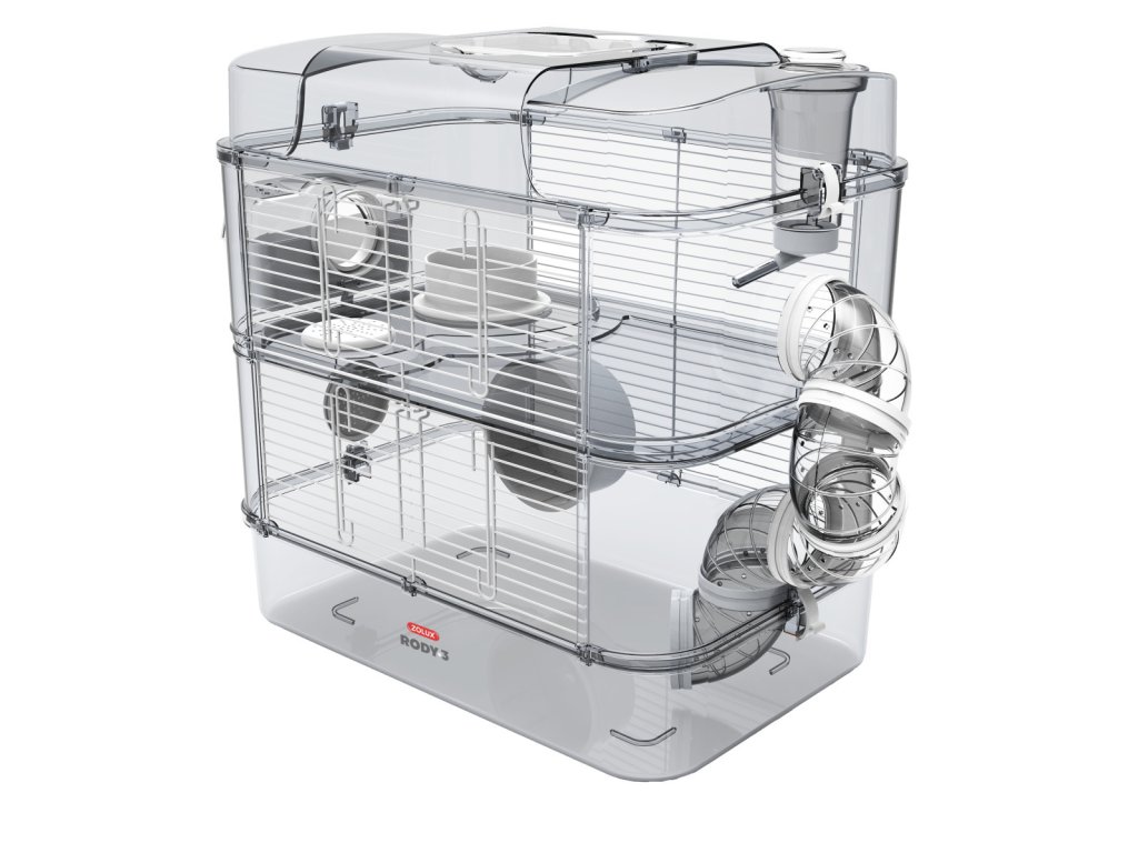 Nová řada klecí RODY 3 pro malé hlodavce v novém designu s inovovaným dnem a horním okrajem. Klece jsou vyrobeny z transparentního plastu v lehkém šedém tónování a jejich součástí je bohaté příslušenství ve 4 trendy barvách (bílá, modrá, žlutá, červená).