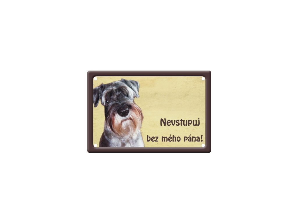 Plechová psí cedulka pro venkovní i vnitřní použití v rozměru 150x100mm, v rozích 4 díry pro uchycení, prolisovaný zdobný okraj tabulky, potištěný plech.