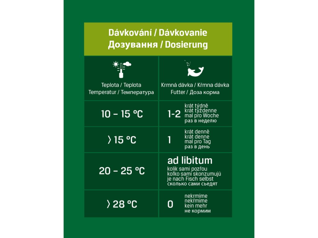 Krmná dávka: Jedna denní krmná dávka odpovídá 1,5% až 2% hmotnosti rybí obsádky (jeden kilogramový kapr v krmné dávce by měl přijmout 15 až 20 gramů krmiva).
