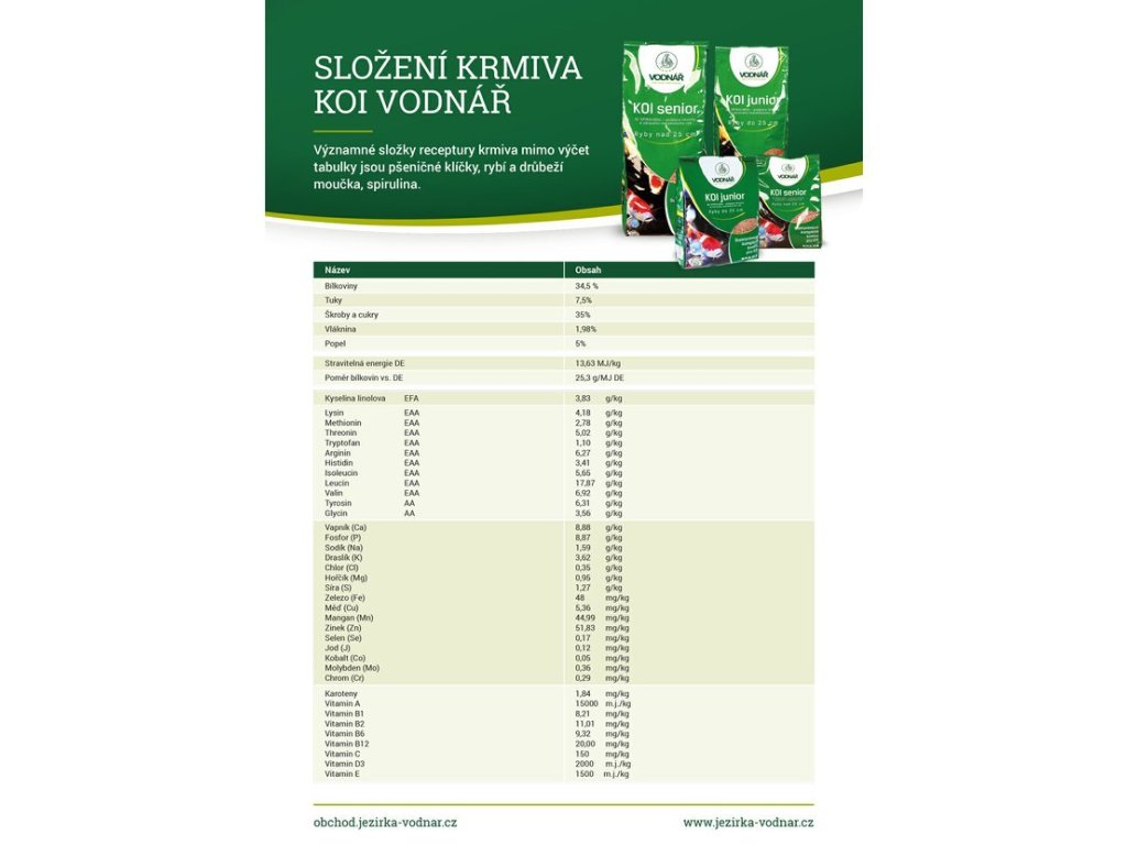 Výživově kompletní krmivo vyrobené z nejjakostnějších surovin dodává všechny potřebné látky pro zdraví, růst, zvýšení imunity a krásné vybarvení. Receptura je vytvořena přímo pro KOI kapry. Krmivo je vyváženo, tak aby ryby zužitkovaly vše, bez zbytečného odpadu, který by zatěžoval filtraci a znečišťoval jezírko. Receptura byla tvořena pro dosažení výborné kondice, zdravotní odolnosti a optimálního růstu. Ryby krmené našim krmivem nemají nadměrně zatěžovány játra a ledviny, a proto nedochází k autointoxikaci ryb při poklesu teploty vody v jezeru.