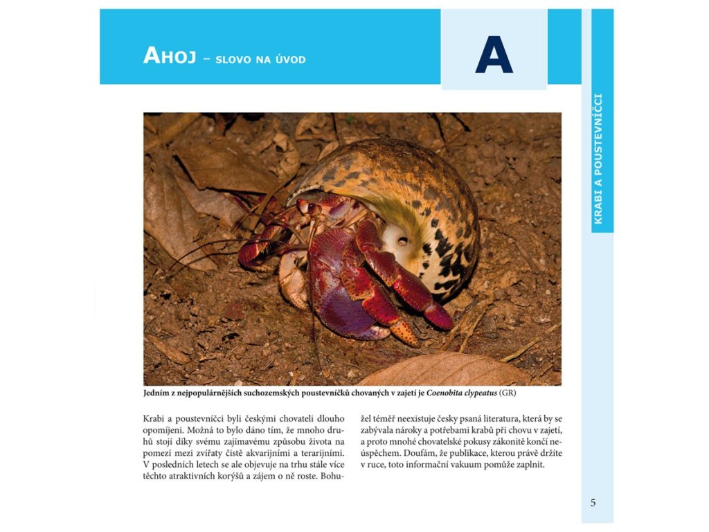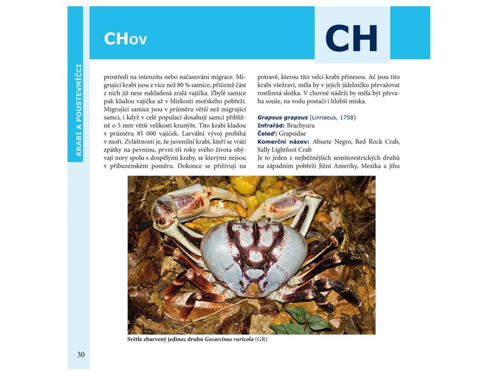 Nejnovější text věnovaný krabům obsahuje veškeré potřebné informace pro chovatele, jak začátečníky, tak i pokročilé. Zmíněné druhy prakticky kompletně odrážejí druhové spektrum dostupné z importů do České republiky.