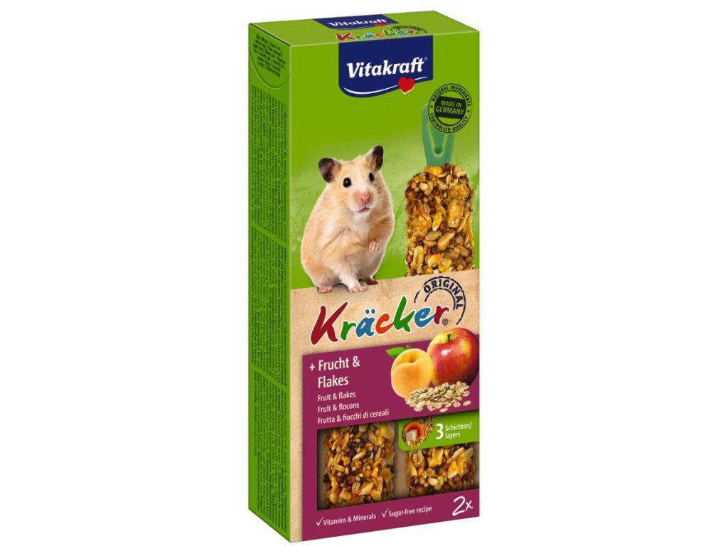 Doplňkové krmivo pro křečky. Tyčinky pro křečky s ovocem a ovesnýma vločkama plné minerálů a vitamínů. Složení: obiloviny (pšeničné vločky 3,2%, ovesné vločky 7,2%), vedlejší výrobky rostlinného původu, minerální látky, semena, ovoce 2%, med.
