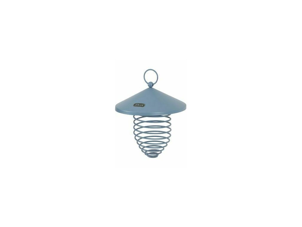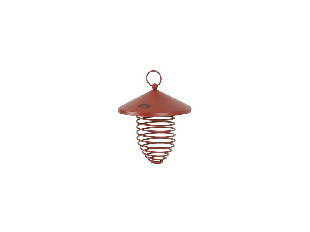 Závěsné kovové krmítko ve tvaru spirály, se stříškou, na lojové koule. Výška spirály 11cm.