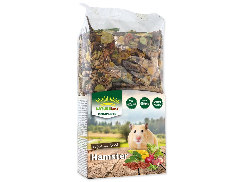 Kompletní krmivo pro zakrslé křečky. Nature Land vždy respektuje přirozené výživové potřeby Vašich mazlíčků. Toto vyvážené kompletní krmivo obsahuje různé druhy obilnin, velké množství semínek, křupavé zeleniny a doplněk živočišné bílkoviny ve formě hovězího, kuřecího, rybího masa a moučných červů, které křečci velice ochotně přijímají. Díky speciálně vyvinutému složení obsahuje toto krmivo vyvážený poměr veškerých živin a minerálních látek potřebných pro správnou funkci organismu. Krmný návod: viz obal. Složení: kukuřice 17%, pšenice, kukuřičné vločky, pšeničné vločky, proso mana 8%, hrachové vločky 8%, oves, proso la plata, semena kanárských trav, semena travin, maso (sušené kuřecí, sušené hovězí 0,9%, sušené ryby), extrudovaná kukuřičná mouka, zelenina (sušená mrkev, sušená červená řepa 1%), lněné semeno, špalda, sušený jitrocel 2%, rýže, sušení mouční červi 0,5%.