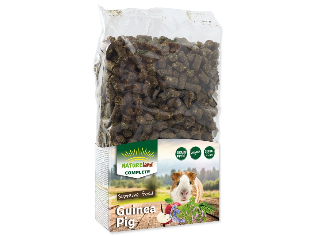 Kompletní krmivo pro morčata. Nature Land vždy respektuje přirozené výživové potřeby Vašich mazlíčků. Bezobilné krmivo ve formě pelet vyvinuté speciálně pro nutriční potřeby morčat. Obsahuje vysoký podíl vitamínu C. Krmivo ve formě granulí zamezí selektivnímu vybírání krmiva, proto má morče zaručen správný poměr všech potřebných živin. Ve složení tohoto krmiva naleznete kromě toho nejlepšího sena z podhůří alpských vrcholů také velké množství bylin, prebiotik a přírodních antioxidantů. Díky tomu pomáhá ke správné funkci trávícího traktu a zároveň podporuje imunitní systém. Speciálně vyvinutý tvar granulí pomáhá přirozené péči o zuby morčat. Vzhledem k přídavku pampelišky a mrkve je toto vyvážené kompletní krmivo velice dobře přijímáno. Krmný návod: viz obal. Složení: sušená vegetace rostoucí na trvalých pastvinách podhůří Alp, zelenina (sušená mrkev, sušený pastinák 0,8%, sušená červená řepa, sušená petržel), hrachové vločky 2,5%, vločky z bobu obecného, byliny (sušená máta peprná, sušená meduňka 0,4%, sušené kopřivy, sušené pampelišky, sušený heřmánek), lněné semeno 0,6%, černý kmín, semena fenyklu, sušená jablka 0,2%.