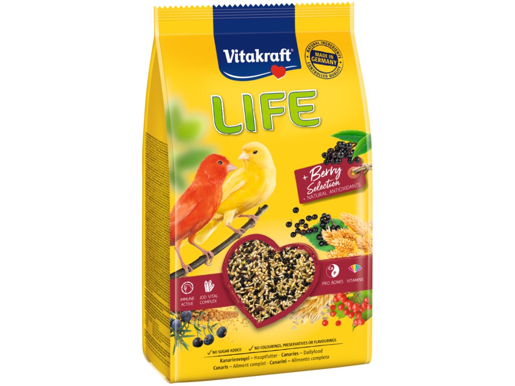 Kompletní krmivo pro kanáry. Krmivo LIFE Power of Nature ve velké míře dopovídá pokrmu, který by kanáři nacházeli v prvodní domovině na kanárských ostrovech. Je šetrně vyrobeno z vybraných vyzrálých sklizní semen jako lesknice, řepka, sezam, len s exotickým ovocem jako kiwi, datle a fíky a také med. Krmivo je obohaceno esencionálnmi vitamíny, minerálními látkami jako i vysocehodnotným rybím tukem zvyšuje u vašeho ptáka schopnost zpívat. LIFE Power of Nature předchází příznakům nedostatků, podporuje látkovou přeměnu a růst opeření. Toto ideální krmivo zvyšuje vitalitu a obranyschopnost.