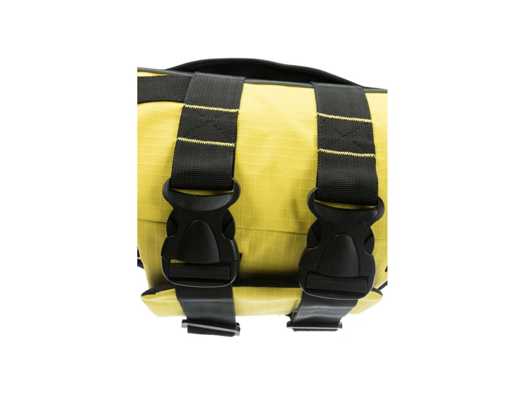 - na zádech vesty je pevné ucho, za které je možné psa vytáhnout z vody nebo ho při plavání nasměrovat tam, kam chcete aby plaval