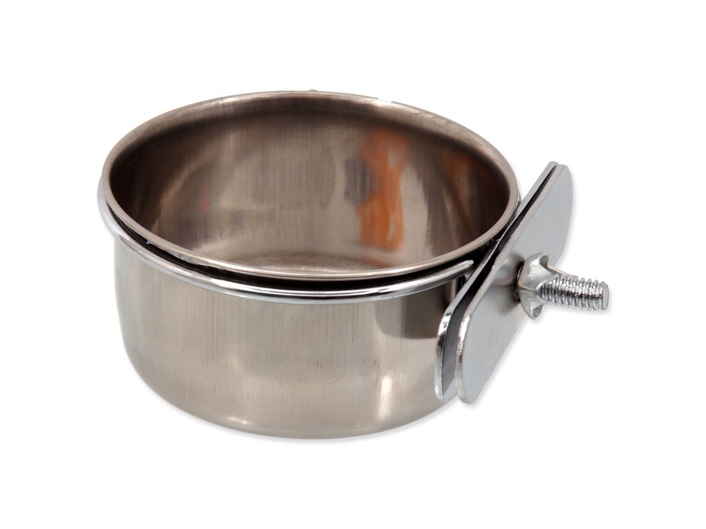 Nerezová miska k přišroubování do klecí pro ptáky.