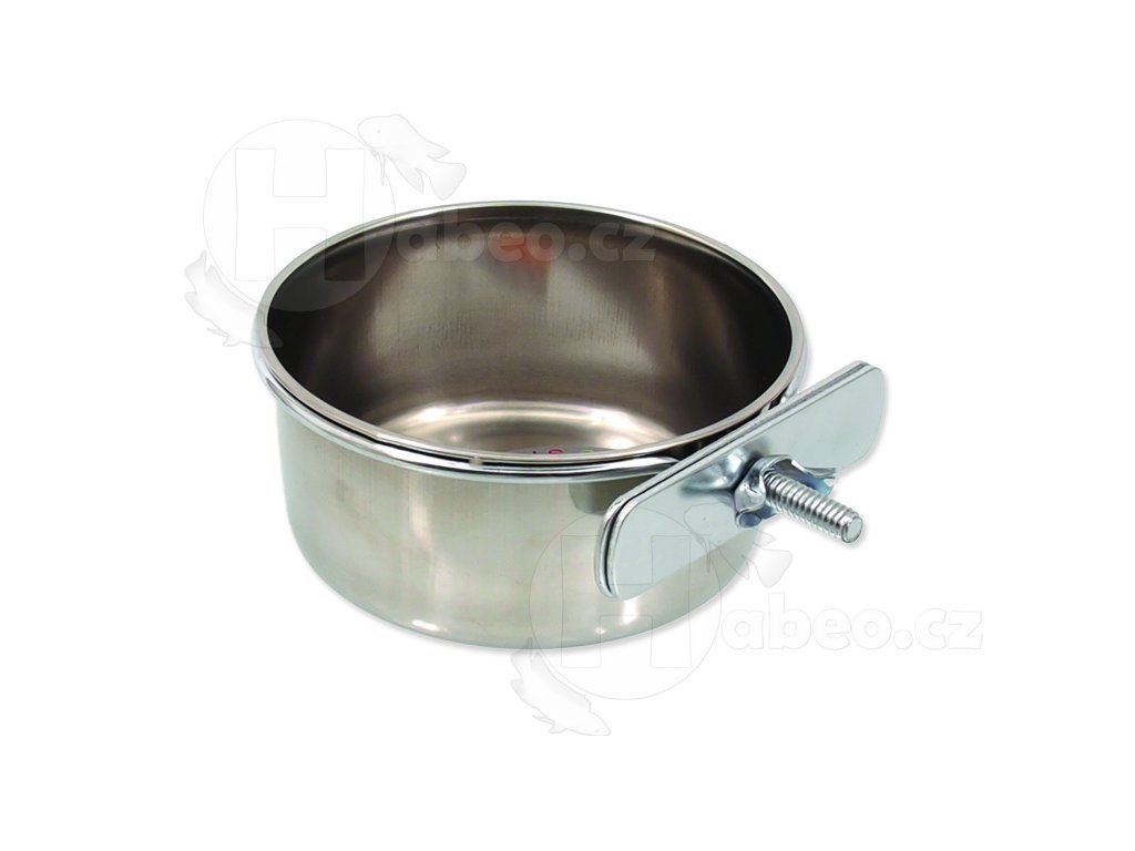 Nerezová miska k přišroubování do klecí pro ptáky. Průměr: 9 cm, výška 4,5 cm, objem 280 ml.