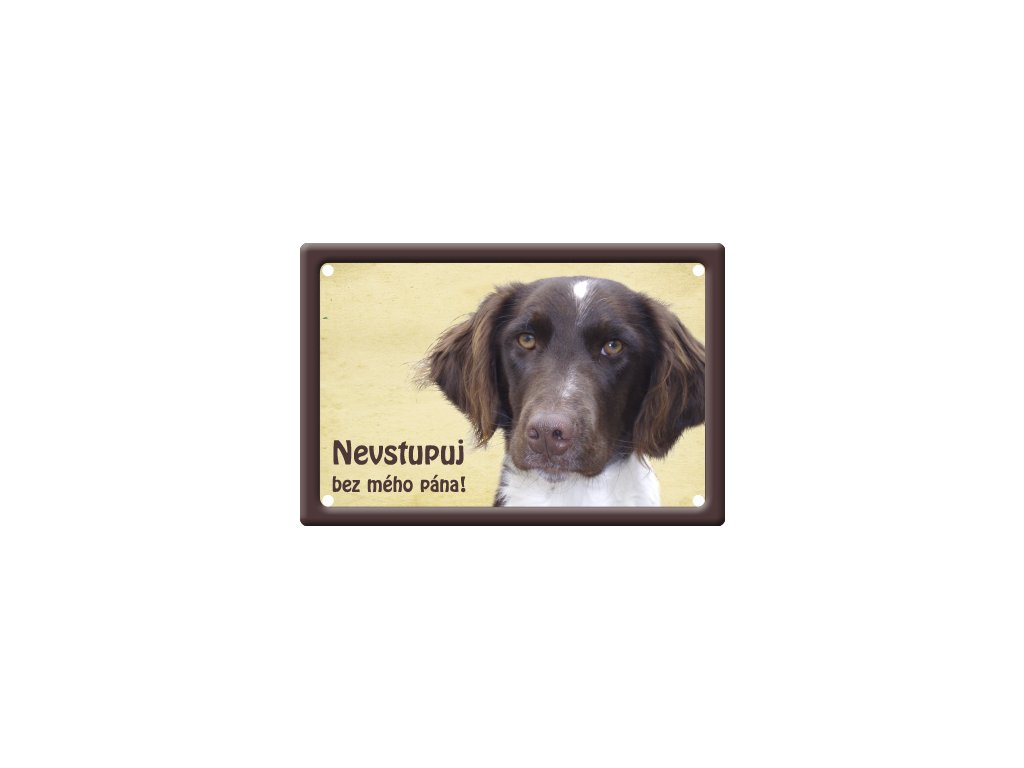 Plechová psí cedulka pro venkovní i vnitřní použití v rozměru 150x100mm, v rozích 4 díry pro uchycení, prolisovaný zdobný okraj tabulky, potištěný plech.