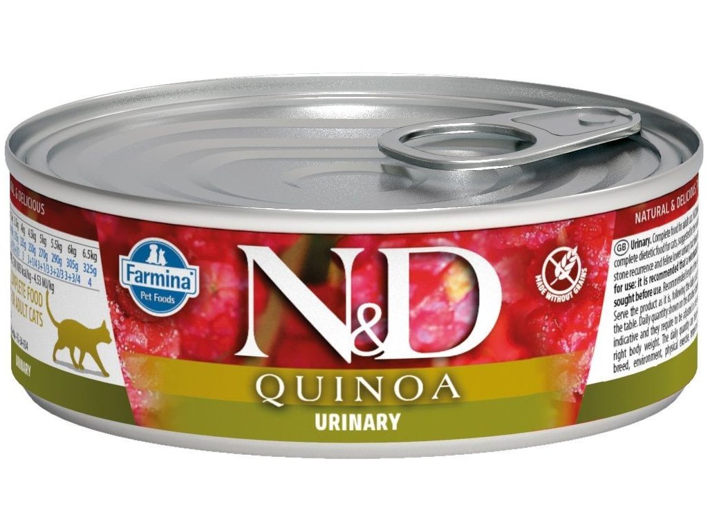 Farmina N&D Quinoa Urinary je krmivo pro zvláštní účely výživy určené k podpoře omezení opakované tvorby struvitových kamenů a onemocnění dolního močového ústrojí koček.