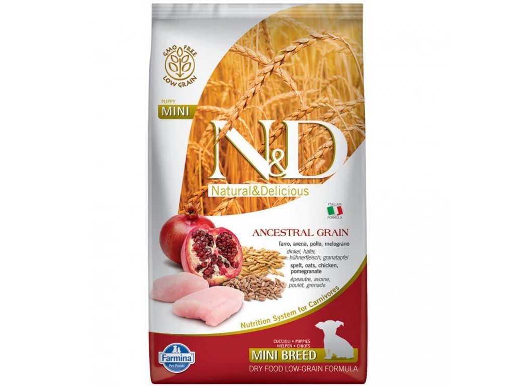 N&D Low Grain Dog Puppy Mini Chicken & Pomegranate je krmivo s kuřecím masem a granátovým jablkem pro štěňata, březí a kojící feny malých plemen. Vláknina je dodávána jen minimem obilovin (pšenice špalda) a také zeleninou a ovocem, především granátovým jablkem. Vynikající chutnost díky neobyčejné kombinaci velice kvalitních surovin.