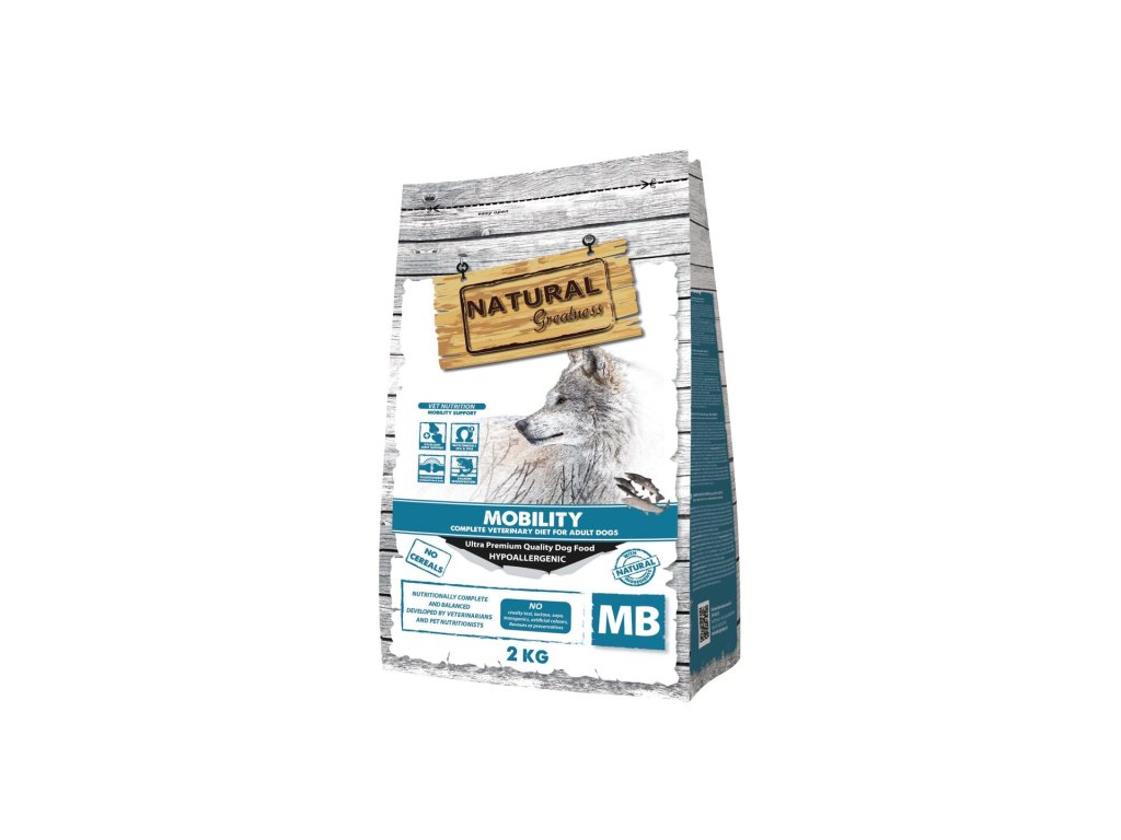 Natural Greatness Mobility je kompletní, hypoalergenní krmivo bez obilovin na doporučení veterinárního lékaře, určené pro všechna plemena dospělých psů, kteří potřebují podpůrnou stravu pro stavy, jako je osteoartritida. Toto krmivo je vyrobeno z lososa jako jediného zdroje živočišných bílkovin. Vyznačuje se vysokým obsahem Omega-3, EPA, DHA, vitamínu E, glukosaminu, chondroitinu a MSM. Přídavek MSM je životně důležitý, protože podporuje metabolismus chrupavky, inhibuje ztrátu a přispívá k její regeneraci.