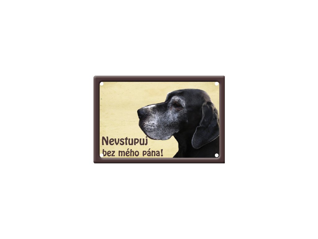 Plechová psí cedulka pro venkovní i vnitřní použití v rozměru 150x100mm, v rozích 4 díry pro uchycení, prolisovaný zdobný okraj tabulky, potištěný plech.
