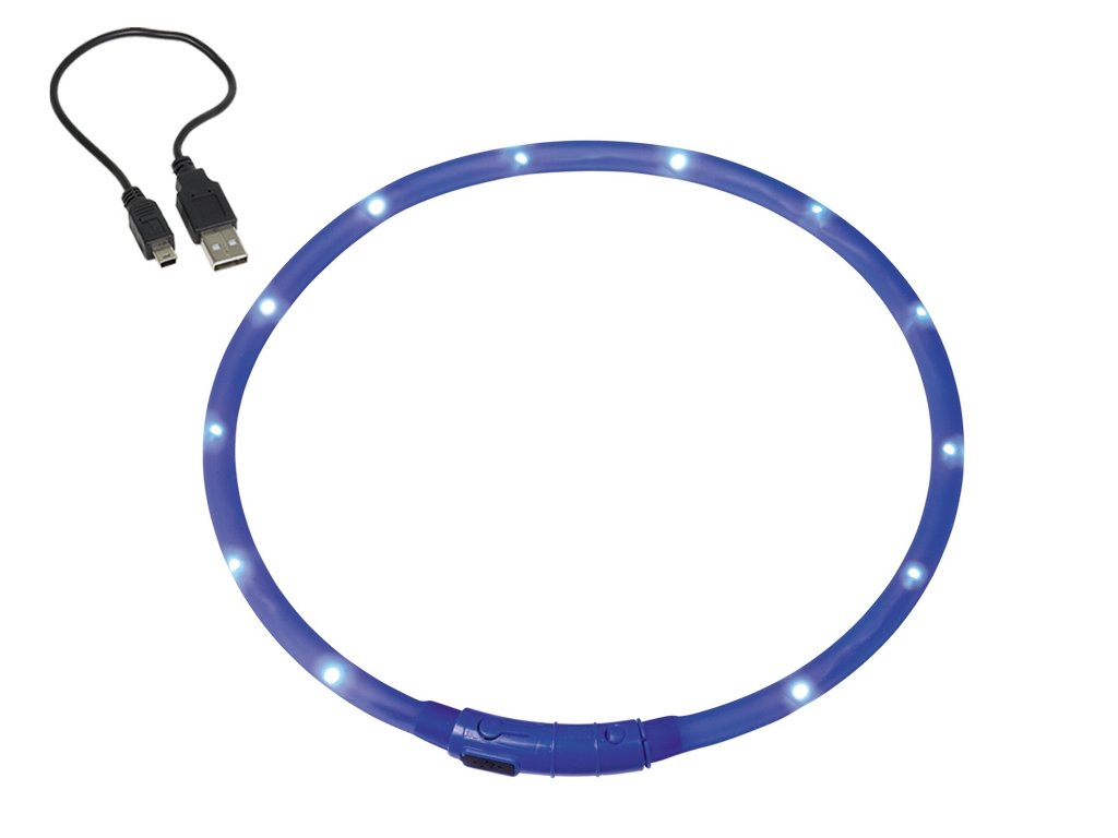 Svítící LED kroužek ze silikonu na krk psa, lze individuálně zkrátit, svítí až 2 hodiny ve 3 různých režimech, viditelný do okruhu 500 m, dobíjení prostřednictvím USB, včetně napájecího kabelu.