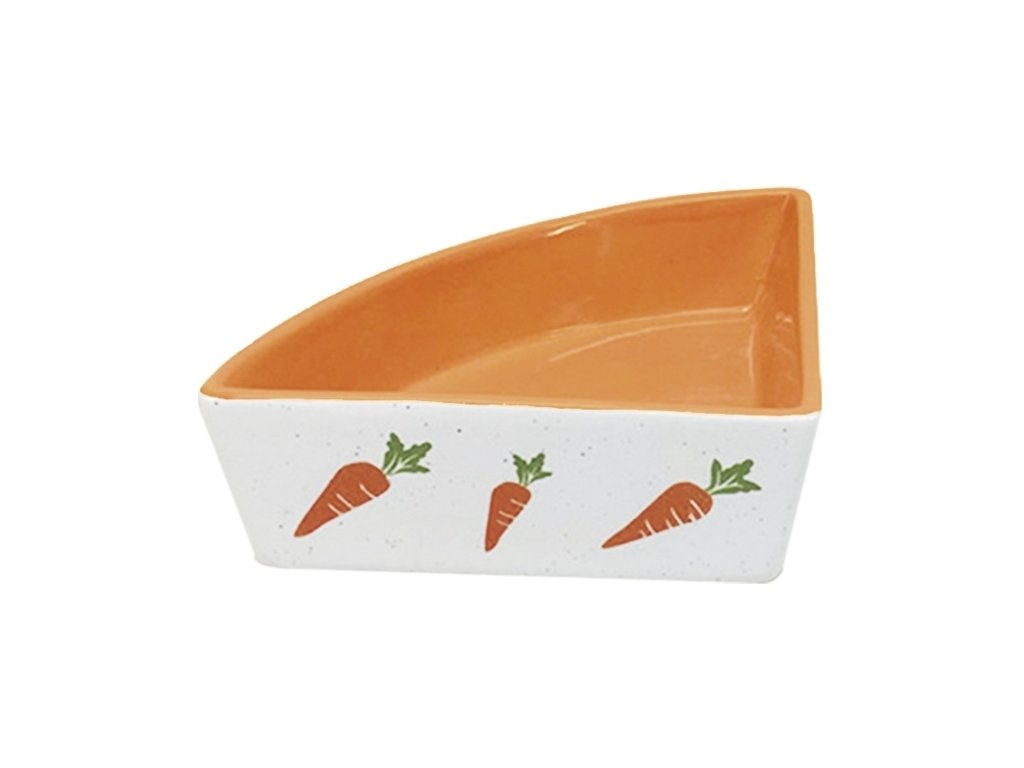 Tato dekorativní rohová miska pro hlodavce od německého výrobce Nobby je speciálně navržena tak, aby zajistila úsporu místa v jakémkoli pelíšku. Miska je uvnitř oranžová, na vnější straně je bílá s potiskem mrkviček a má lesklou glazuru.