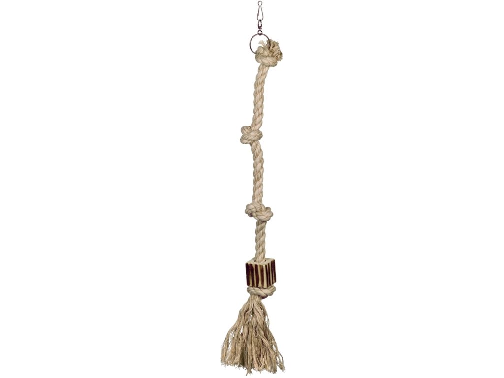 Šplhací silné lano ø 2,3 cm s 4 uzly a dřevěnou kostkou pro papoušky. Snadné zavěšení do klece. Celková velikost 73 cm.