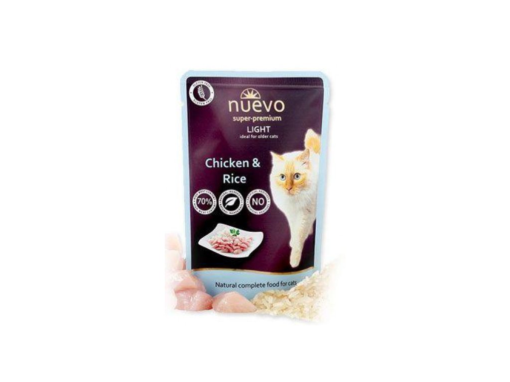 Kočičí kapsa Nuevo light kuřecí s rýží je kompletní krmivo pro dospělé kočky s nadváhou s kuřecím masem a rýží. Díky vysokému obsahu masa a přírodních surovin a žádnému obsahu umělých přísad, obilí a lepku patří toto krmivo do vysoce kvaliního a i ta nejvybíravější kočička si jej určitě zamiluje!