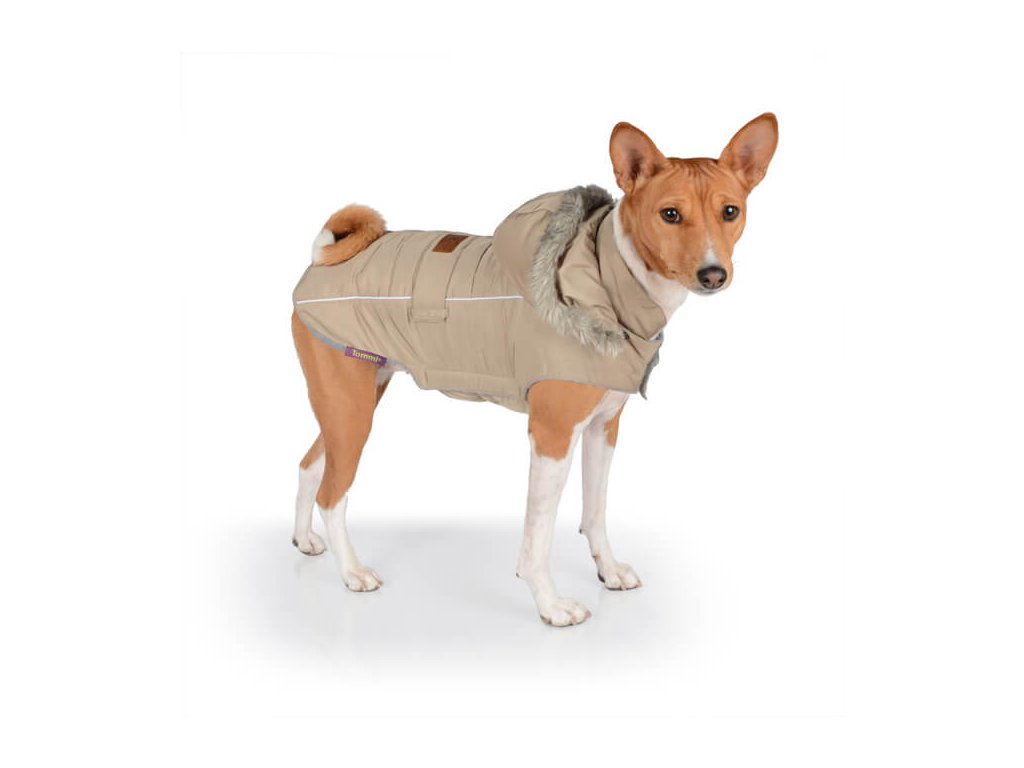 Outdoorový model do zimního počasí s odepínací kapucí. Módní design v přírodní barvě.
