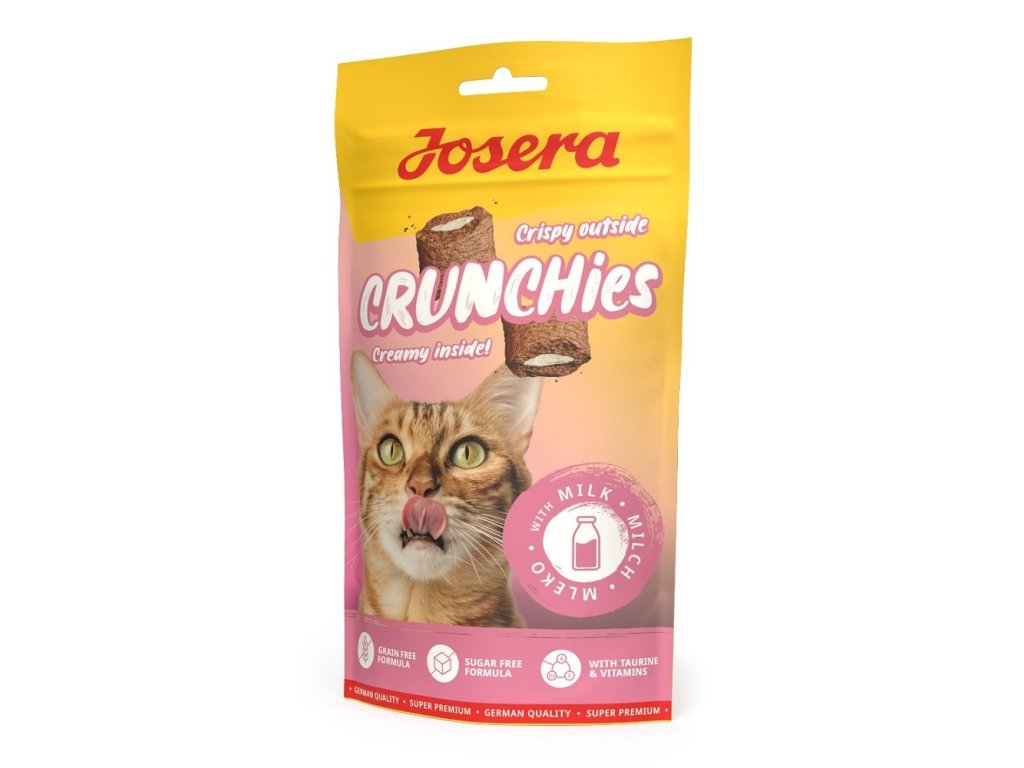 Některé věci se nikdy nemění: naši malí tygříci šílí při pohledu na mléko už od doby, kdy byli koťaty - a dnes si mohou pochutnat na Josera Crunchies s mlékem! Receptura nízkokalorického snacku bez obilovin byla zdokonalena. Křupavá skořápka obsahuje krémovou náplň, kterou si zamiluje i vaše kočka. Do receptury byly přidány cenné vitamíny a taurin a vláknina navíc pomáhá s odbarvujícím účinkem. Josera se vyhýbá zbytečným přísadám: Crunchies neobsahují cukr, sóju, barviva ani konzervační látky.
