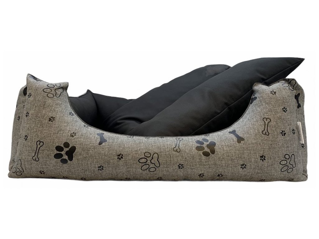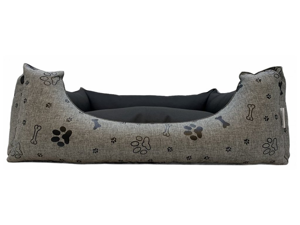 Na zakázku vyráběný elegantní pelíšek Petee Foot Black v kombinaci šedé a černé vzorované látky. Vybrat si můžete z několika velikostí. Je na zakázku vyroben z kvalitní voděodolné látky, na které nelpí chlupy. Pelíšek Foot Black je dodáván buď s polštářem nebo s molitanovou matrací se snímatelným potahem. Matrace má výšku 4cm.