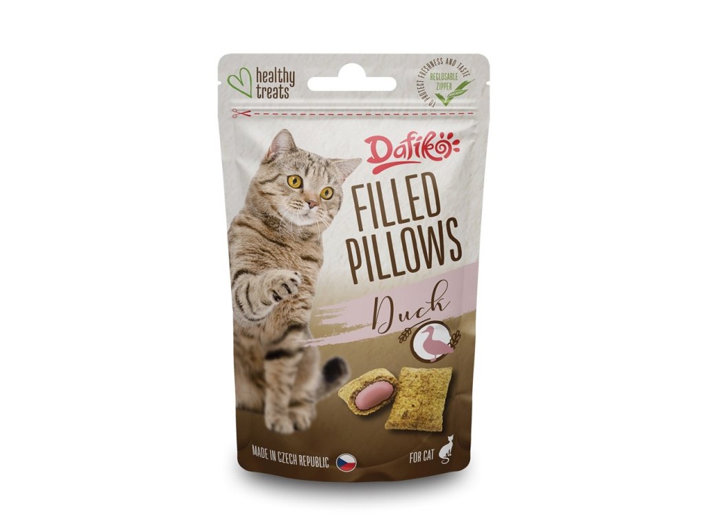 Pamlsek pro kočky ve formě plněných kachních polštářků