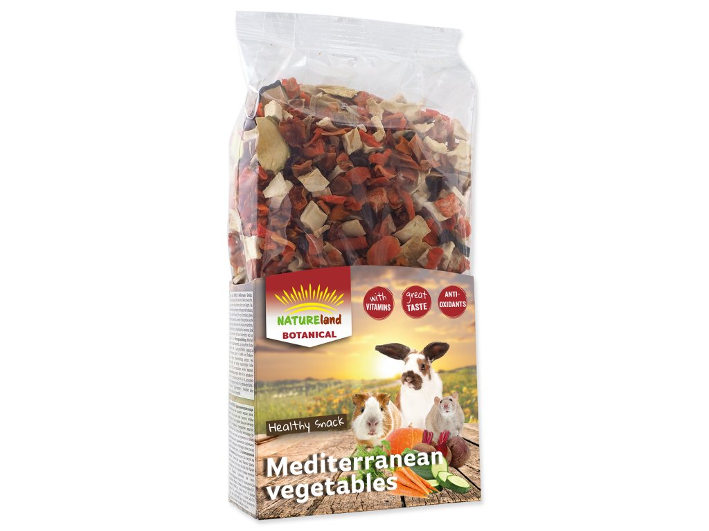 Doplňkové krmivo pro králíky hlodavce. Pečlivě vybraná středomořská zelenina, která prospívá zdraví vašeho mazlíčka je přírodní doplňkové krmivo pro králíky, morčata, činčily a ostatní běžně chované druhy hlodavců. Toto doplňkové krmivo obsahuje velké množství vlákniny pro správné zažívání zvířat. Šetrný proces sušení, který byl pro výrobu tohoto krmiva použit byl vyvinut z důvodu zachování chutnosti zeleniny a zachování veškerých obsažených vitamínů a antioxidantů. Díky svému složení krmivo obsahuje vitamíny skupiny A, C a E. Složení: sušená mrkev 50%, sušený pastinák 20%, sušená červená řepa 10%, sušená rajčata 10%, sušená cuketa 5%, sušená dýně 5%.