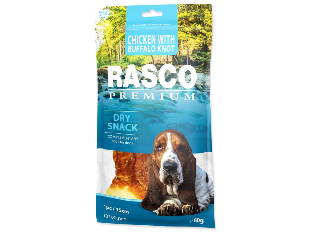 Pochoutka Rasco Premium buvolí kůže obalená kuřecím, uzel 15cm 80g
