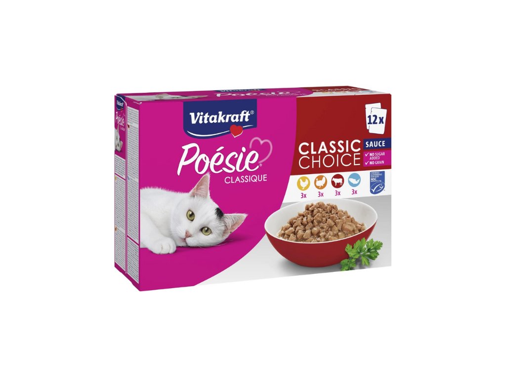 Obsah balení: 3x krůta v omáčce, 3x kuře v omáčce, 3x hovězí v omáčce, 3x losos v omáčce