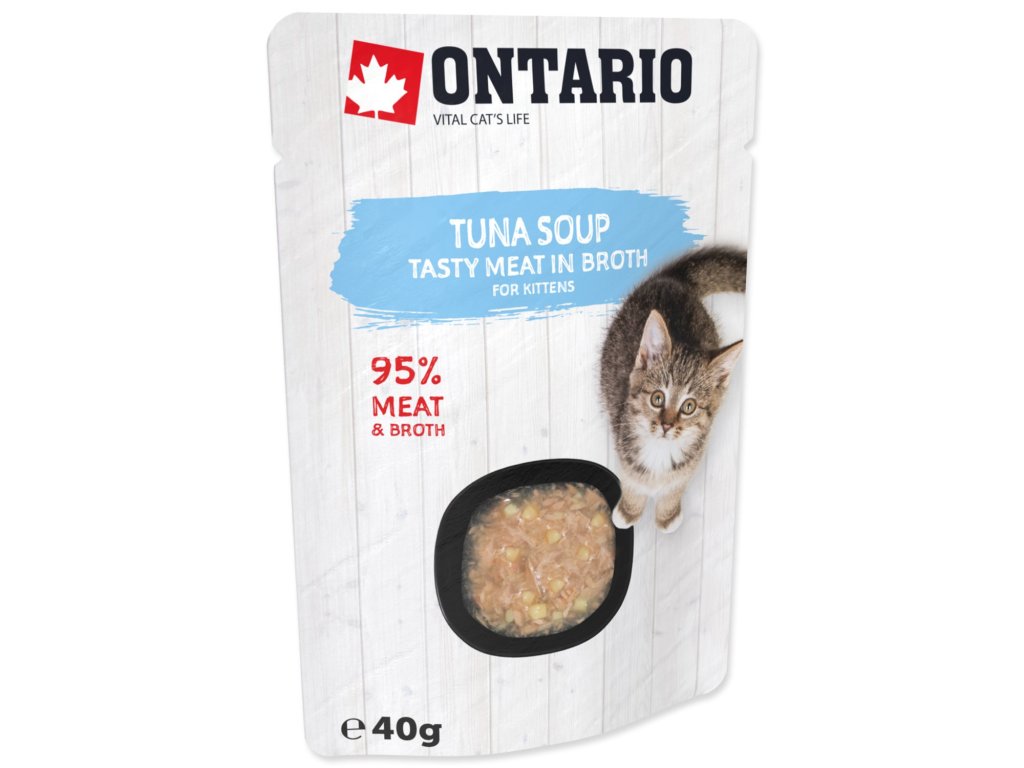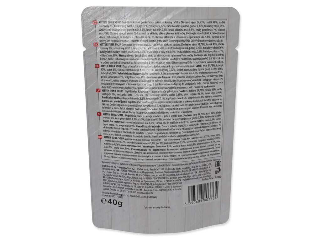Doplňkové krmivo pro koťata – polévka s kousky tuňáka, kterou můžete dopřát samostatně mebo jako doplněk k suchému krmivu.