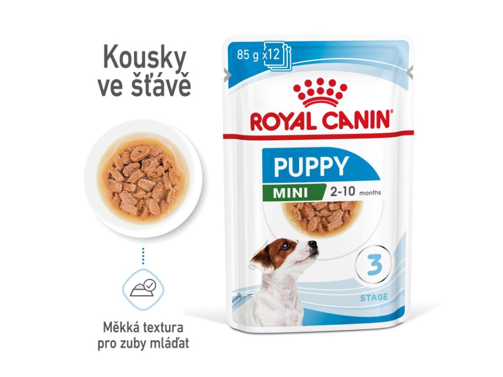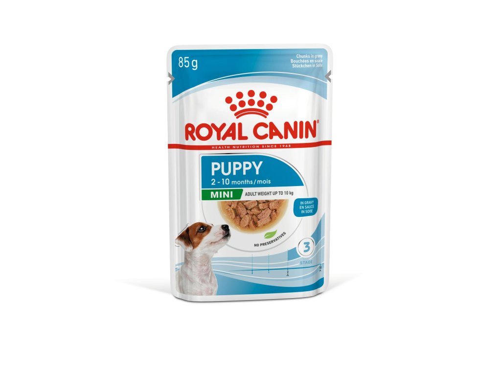 ROYAL CANIN® Mini Puppy in Gravy je vhodný pro štěňata ve věku do 10 měsíců, která budou mít v dospělosti hmotnost do 10 kg, je speciálně vytvořen s ohledem na všechny nutriční potřeby vašeho mini štěněte. Protože se přirozená obranyschopnost vašeho štěněte stále vyvíjí, ROYAL CANIN® Mini Puppy in Gravy obsahuje exkluzivní komplex antioxidantů – včetně vitaminu E – na podporu jeho imunitního systému v době, kdy ještě dospívá.