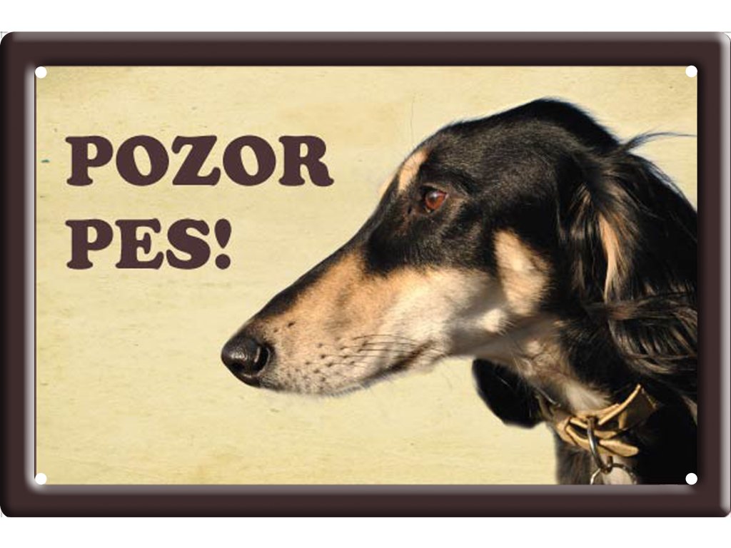 Plechová psí cedulka pro venkovní i vnitřní použití v rozměru 150x100mm, v rozích 4 díry pro uchycení, prolisovaný zdobný okraj tabulky, potištěný plech.