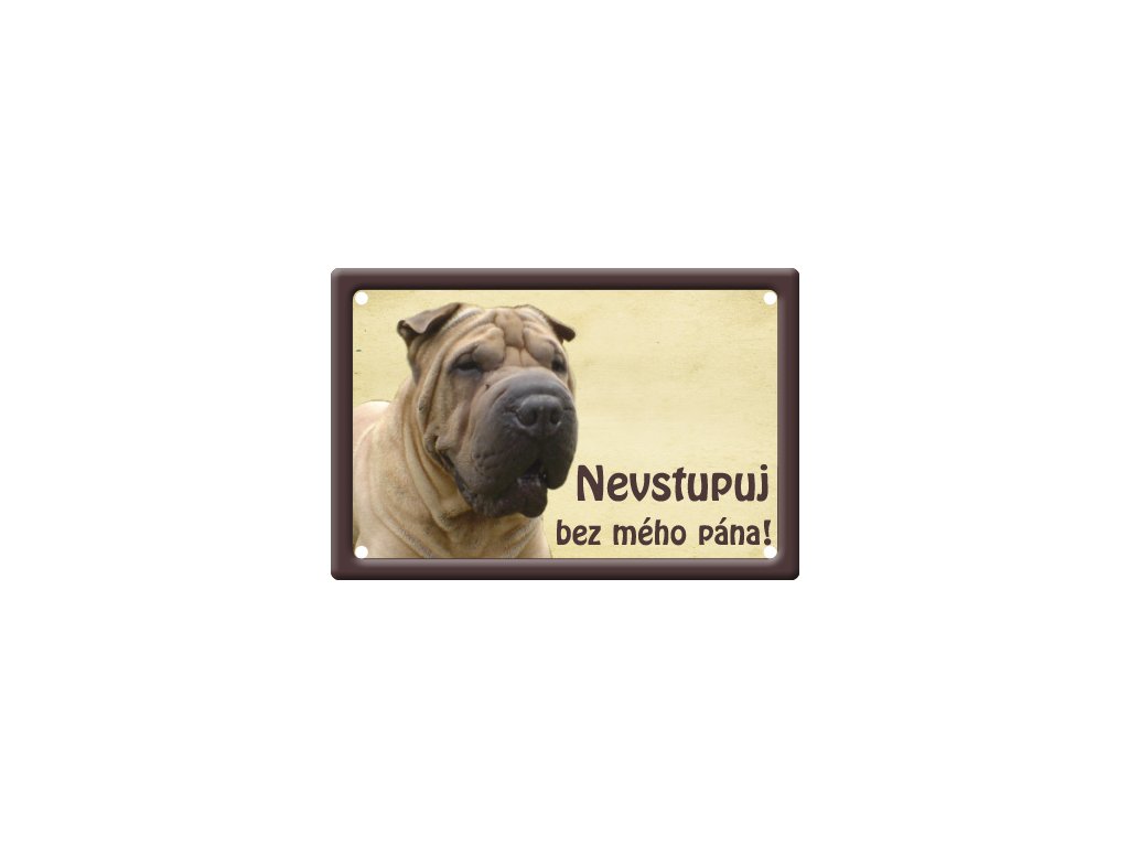 Plechová psí cedulka pro venkovní i vnitřní použití v rozměru 150x100mm, v rozích 4 díry pro uchycení, prolisovaný zdobný okraj tabulky, potištěný plech.