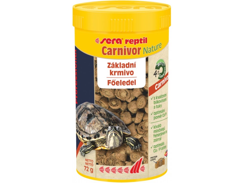 sera reptil Professional Carnivor je jedinečné koextrudované doplňkové krmivo pro masožravé plazy jako např. různé druhy vodních želv. Prstenec obsahuje vyváženou směs vodních organismů jako ryby, gamarusy a krill a dodává kvalitní bílkoviny a tuky. V jádru jsou životnědůležité vitamíny – šetrně zpracované za nízkých teplot – minerály a rovněž řasy k posílení imunity. Základem pro zdravý vývoj kostí a krunýře je optimální poměr vápníku/fosforu.