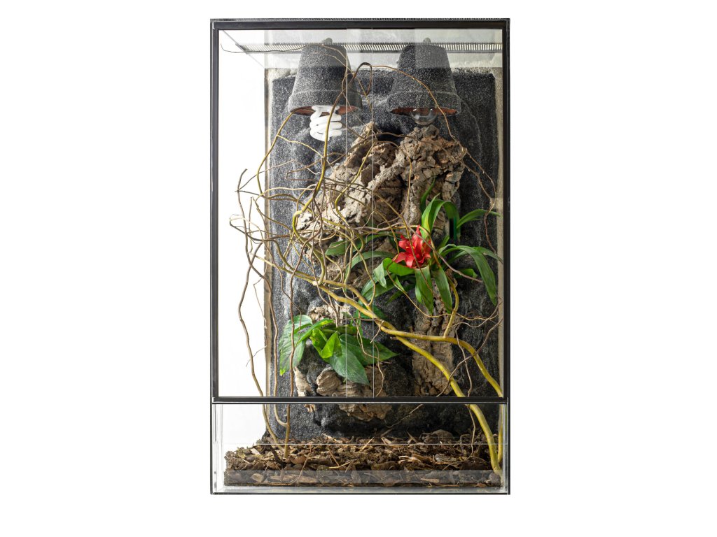 Skleněné terárium s korkovým 3D pozadím osazeným rostlinami o rozměrech 40x40x60 cm je ideální volbou pro chov terarijních živočichů žijících na větvích.