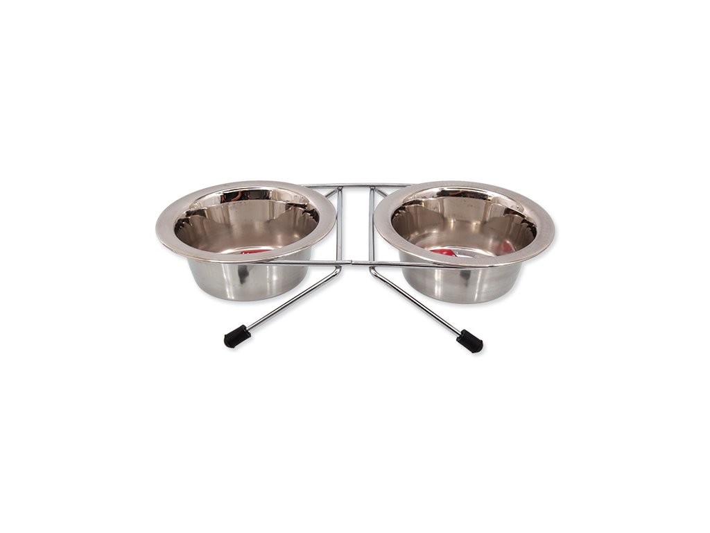 Stojánek s nerezovými miskami. Průměr misek: 11 cm, výška 4 cm, objem 2 x 0,20 l. Výška stojánku 4 cm.