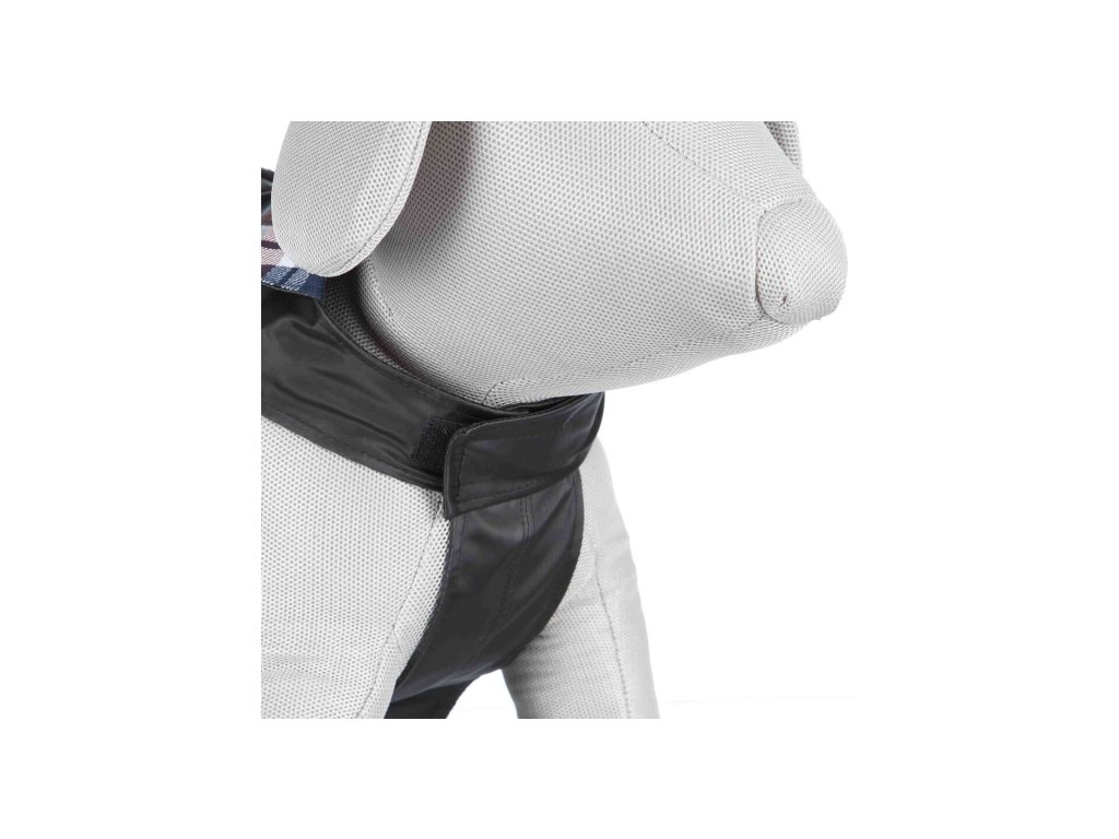 Pro snadnější oblékání a lepší přizpůsobení tělu psa je obleček opatřen zapínáním na suchý zip umístěným v oblasti hrudníku.