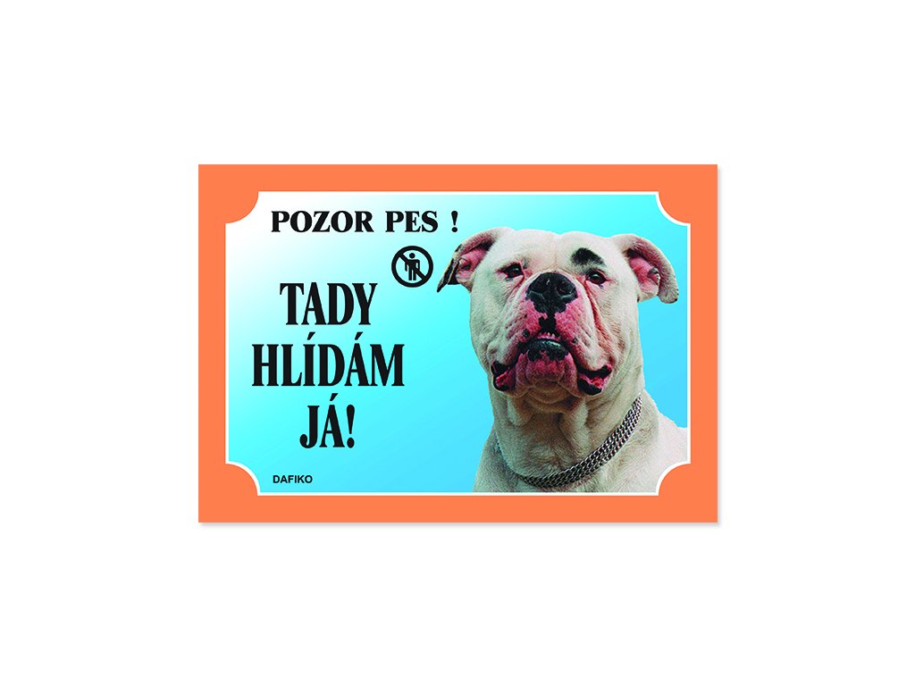 Plastová výstražná tabulka s nápisem: POZOR PES! TADY HLÍDÁM JÁ! a s vyobrazením amerického buldoka.
