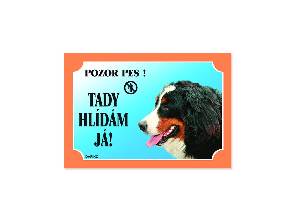 Plastová výstražná tabulka s nápisem: POZOR PES! TADY HLÍDÁM JÁ! a s vyobrazením bernského salašnického psa.