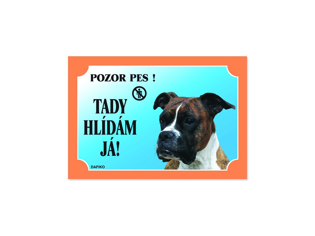 Plastová výstražná tabulka s nápisem: POZOR PES! TADY HLÍDÁM JÁ! a s vyobrazením boxera.