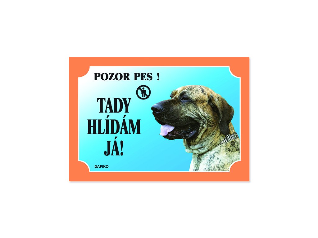 Plastová výstražná tabulka s nápisem: POZOR PES! TADY HLÍDÁM JÁ! a s vyobrazením brazilské fily.