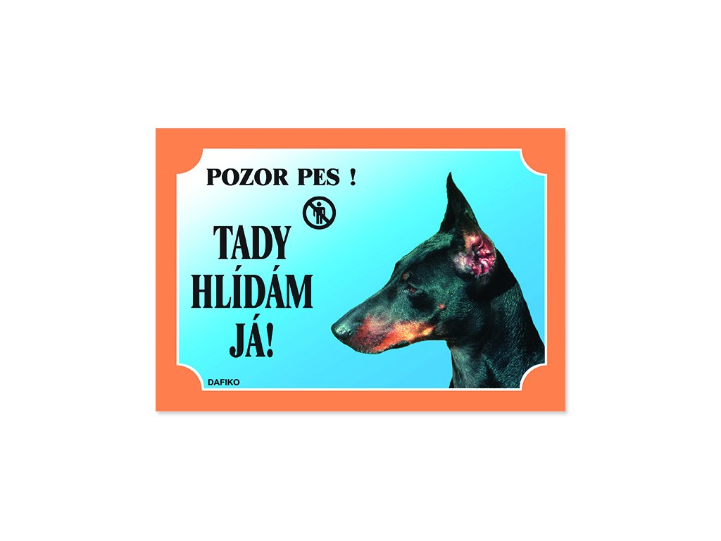 Plastová výstražná tabulka s nápisem: POZOR PES! TADY HLÍDÁM JÁ! a s vyobrazením dobrmana.